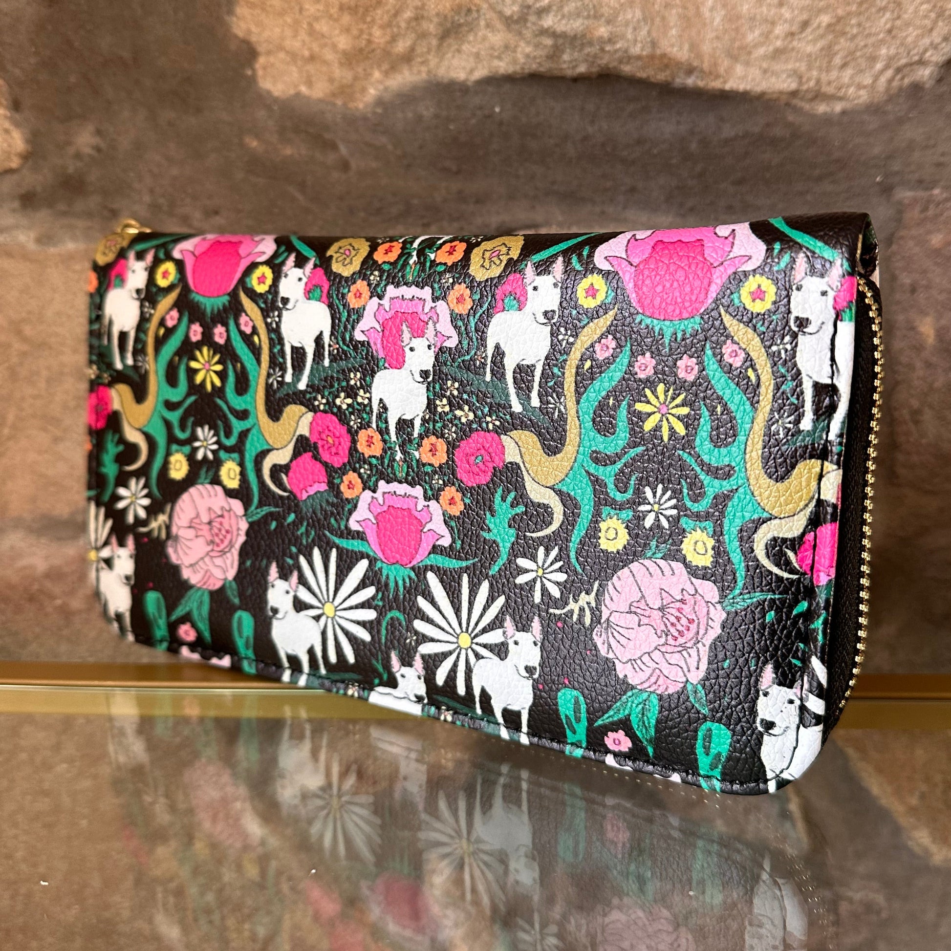 This purse comes in a variety of my original bull terrier prints including custom so if you’d like a different design on yours please just ask (emily@emilydevine.co.uk)
