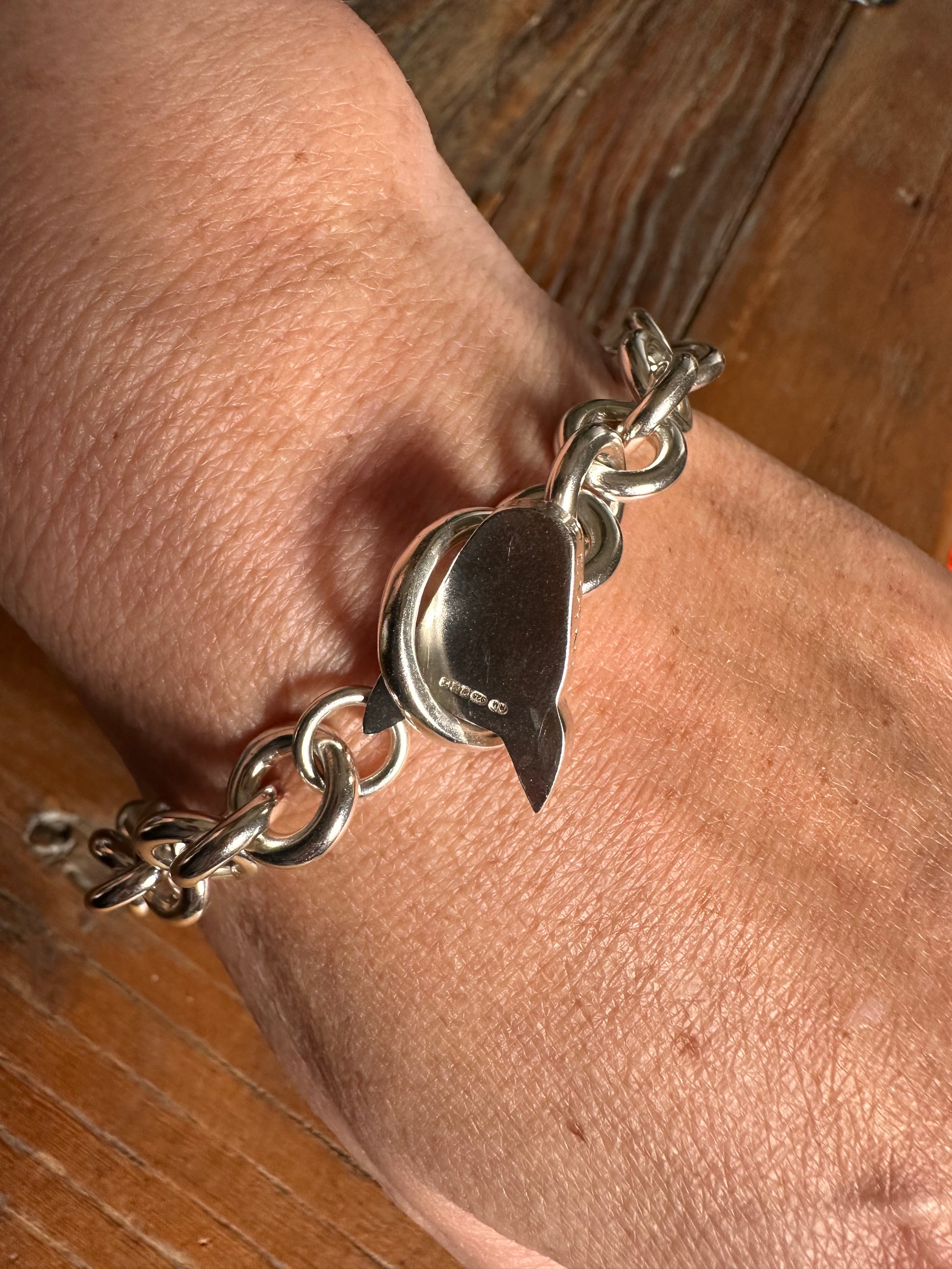The bull terrier pendant is engraved with the designers name around the edge and it can move freely back and forward but never moves through the hoop releasing the bracelet. Instead the fastening is on the other side blending in with the rest of the chain. This makes it quite intriguing to play with and to show to others.