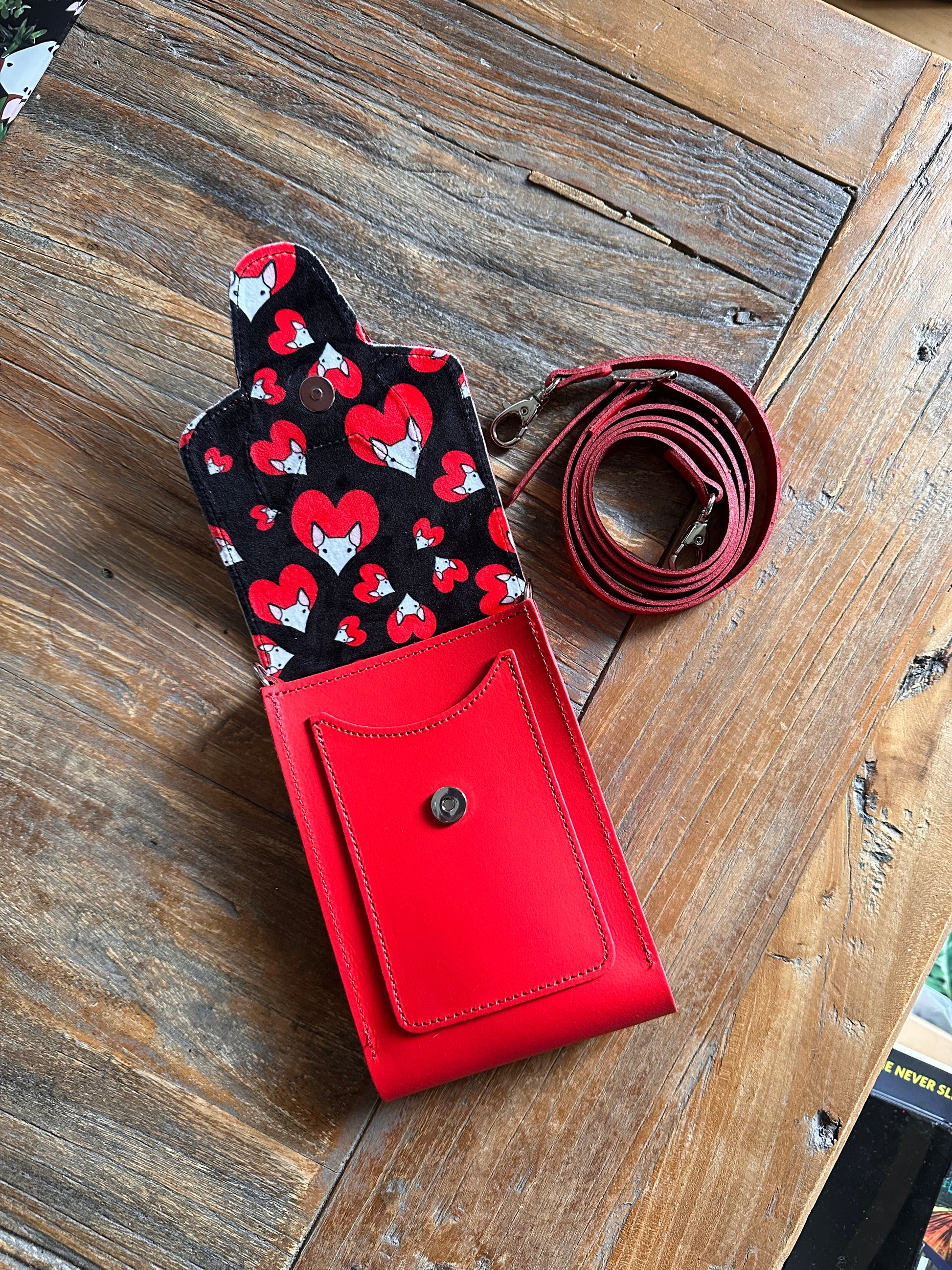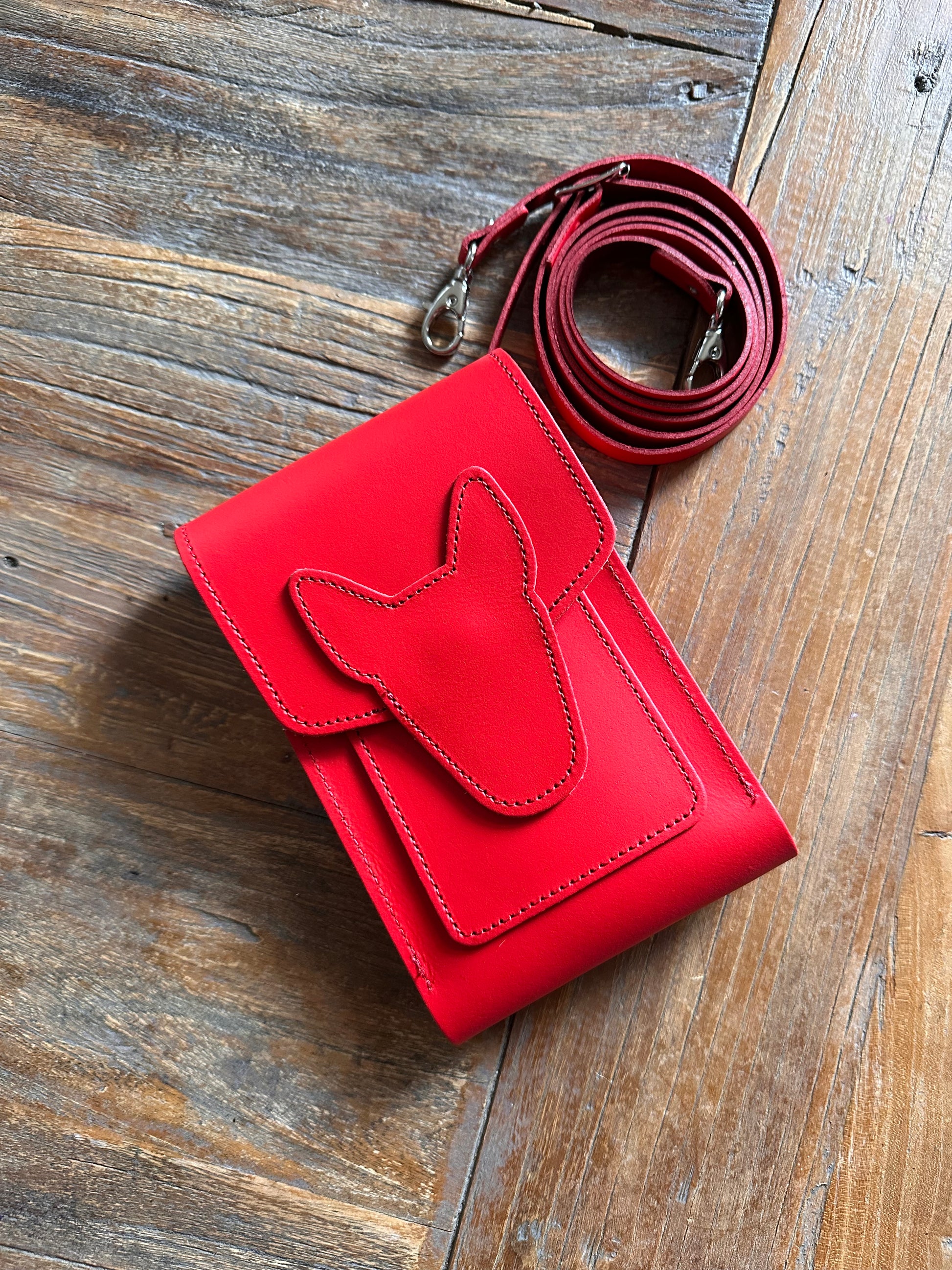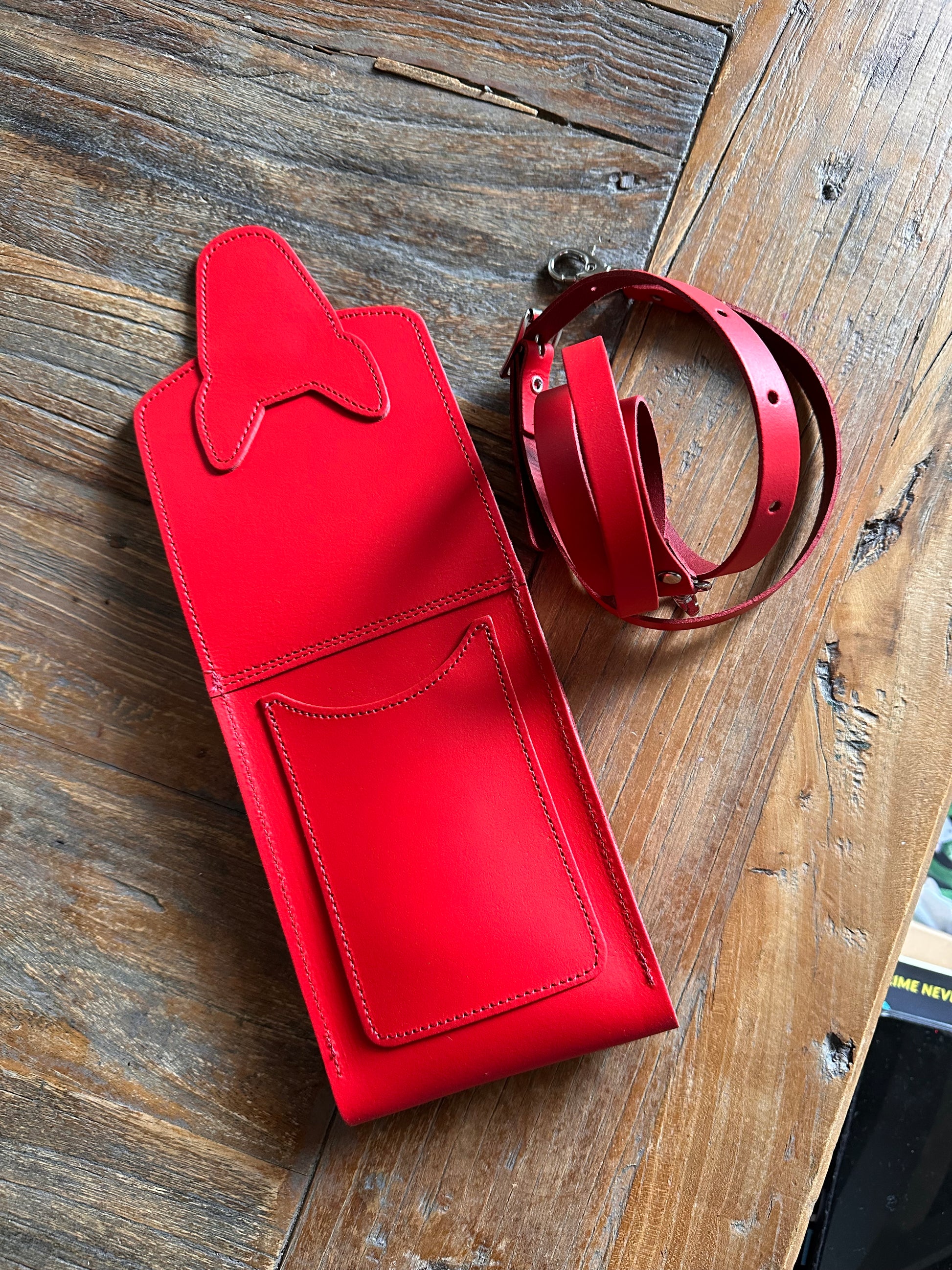 This handmade leather mobile phone pouch is the perfect accessory for your phone, a lipgloss and some poo bags. Pockets on the front and back for credit cards and room keys.