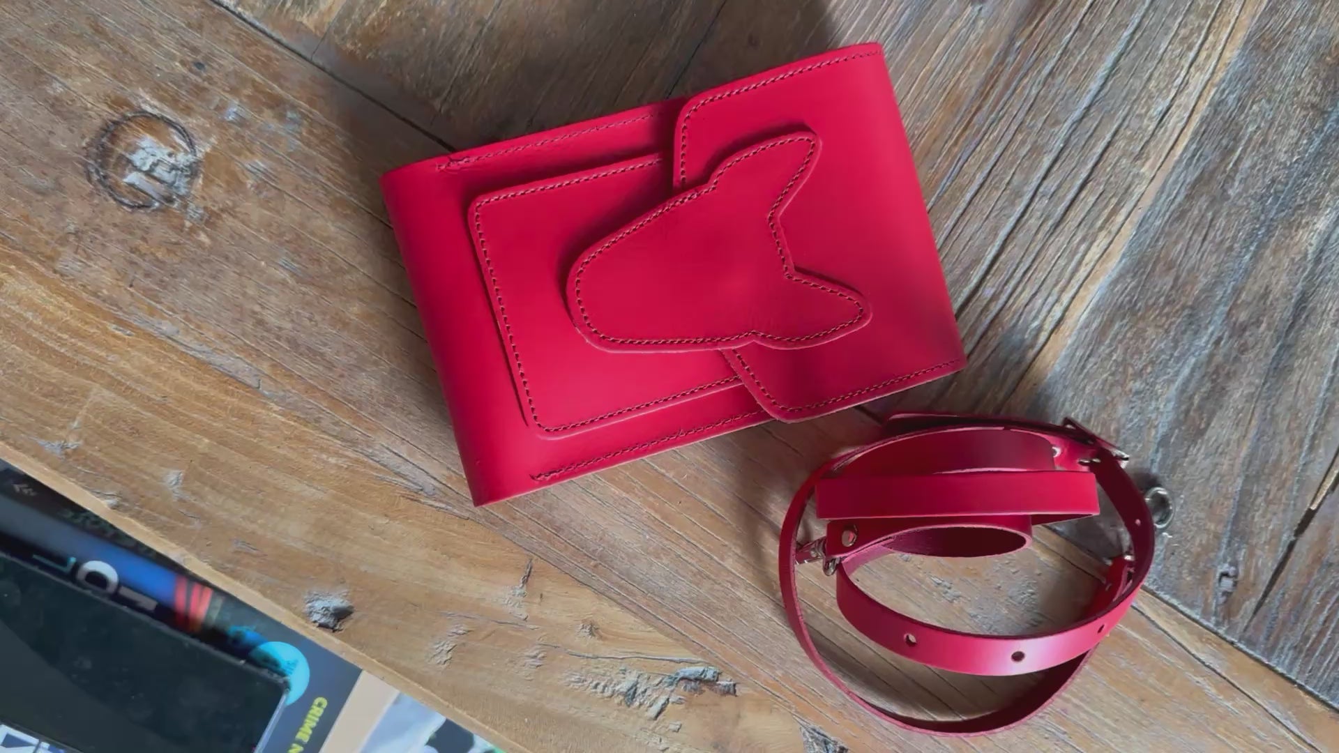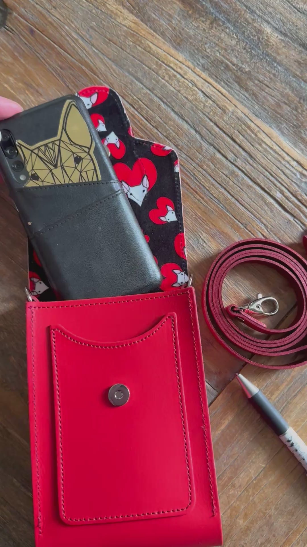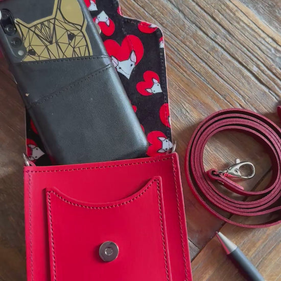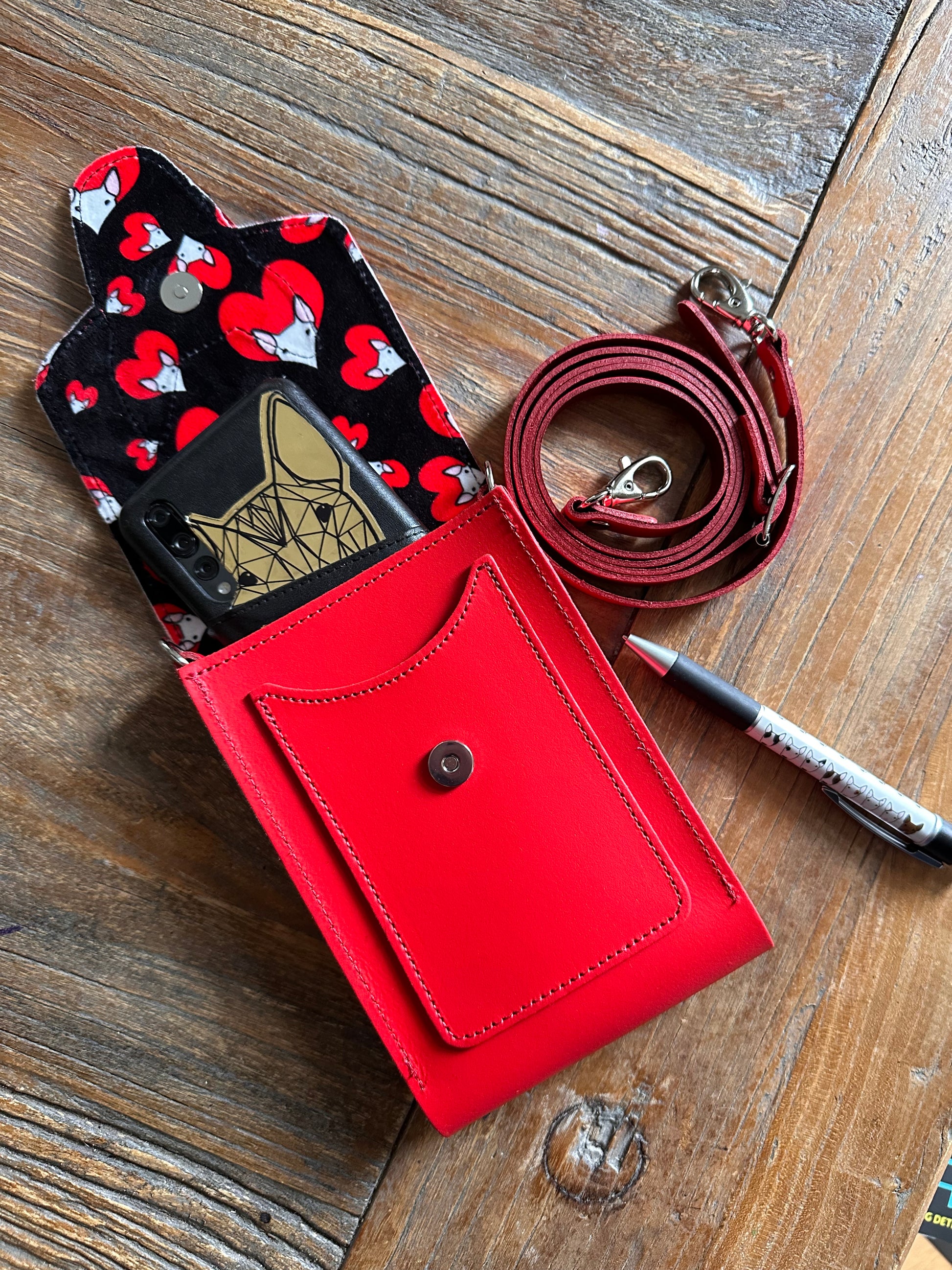 This handmade leather mobile phone pouch is the perfect accessory for your phone, a lipgloss and some poo bags. Pockets on the front and back for credit cards and room keys.